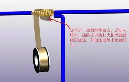 多用于吊項(xiàng)內(nèi),或比較高能的工程中,主線不能能弄斷,符線繞主線6--8周,吊頂內(nèi)的射燈,一路上要有很多燈就是這樣接法,用防火膠布纏在里面它的作用就是防止電打火燒壞東西這是在吊頂內(nèi)很重要的,外面在用絕緣膠布纏繞。