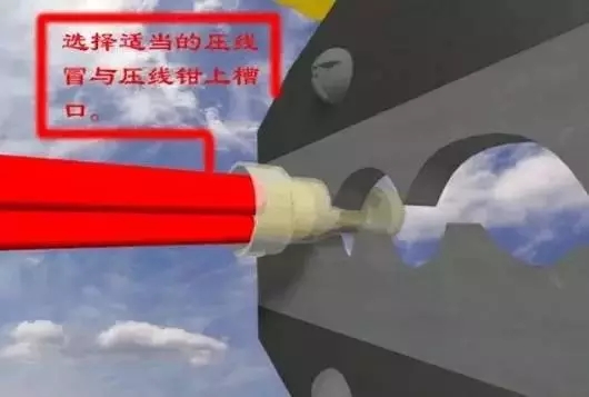 下面的接法就是壓線冒接線法,這種方法是最規(guī)范和最實(shí)用的,但是它需要專用工具來(lái)做,壓線冒的壓線鉗來(lái)壓線,把壓電線用的專用鉗子,套在壓線冒上,用力壓緊就行了。