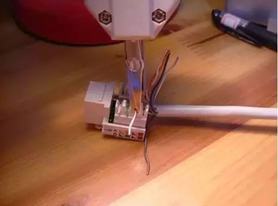3、將全部的線都?jí)哼M(jìn)各槽位后,用工具壓住模塊和線,用力壓下去,將線卡在模塊里面,并把多余的先頭剪掉。