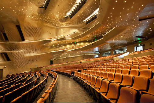 大劇院觀眾廳由于對聲學的苛求,除了地面是厚實的木地板外,墻面、頂面全部采用GRG產品。大劇場觀眾廳采用的“雙手環(huán)抱”設計,要求產品具有極好的抗彎、抗拉伸性能,這樣有利于制作出各種造型,不會因為溫度、濕度或者長時間使用而產生彎曲、變形,而引起造型發(fā)生改變的現象發(fā)生。美穗GRG材料正是因為它材料品質相對穩(wěn)定,在120度高溫下保存72小時,造型的可變率只有0.07%,材料根本不會像其他材料因為環(huán)境冷、熱、干、濕變化而受到影響,而這種性能可以讓大劇院的造型永不改變。